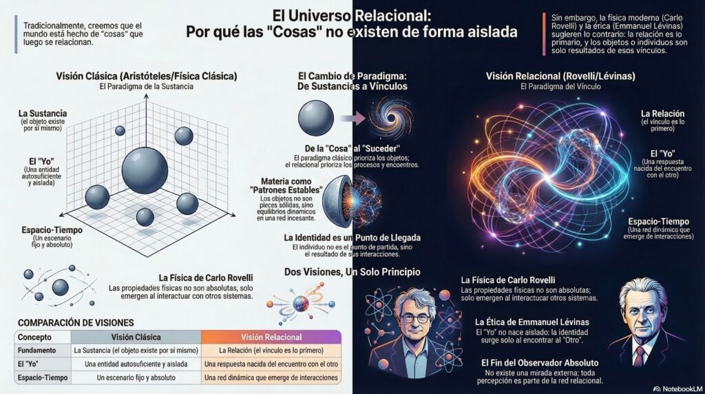 Pero lo más profundo de Rovelli no es solo técnico. Su filosofía física es relacional: no existe una realidad objetiva única “allá afuera”, sino múltiples descripciones dependiendo del sistema que interactúa. La realidad está hecha de sucesos, destellos, acoplamientos. Lo elemental no es la cosa, sino el encuentro.